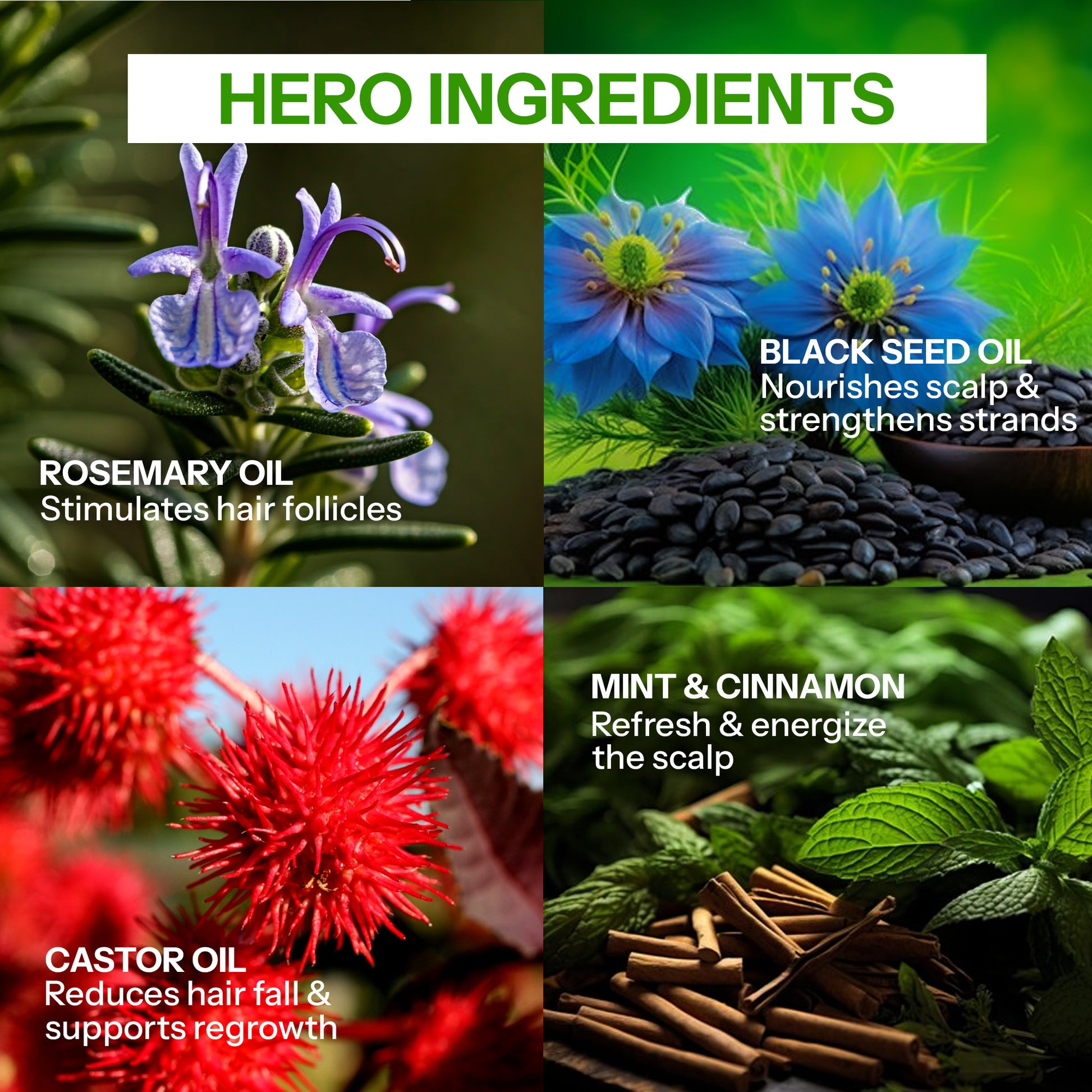 Rosemary Extract, Castor Oil, Coconut Oil, Argan Oil, Vitamin E, Almond Oil, Jojoba Oil, Peppermint Oil, Hibiscus Extract, Amla Extract, Aloe Vera, Bhringraj Extract, Neem Oil, Batana Oil, Tea Tree Oil.